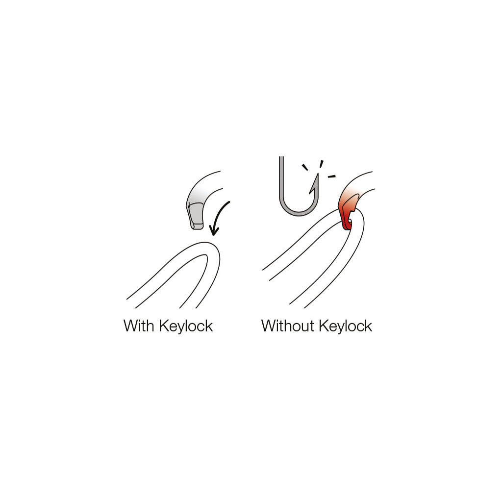 - um ein optimales Handling zu gewährleisten, ist der Karabiner mit dem Keylock-System ausgestattet: die aus Körper und Schnapper bestehende Schnittstelle hat keine Haken und kann sich daher nicht an Sicherungspunkten, am Seil, an der Materialschlaufe des Gurts usw. verhängen