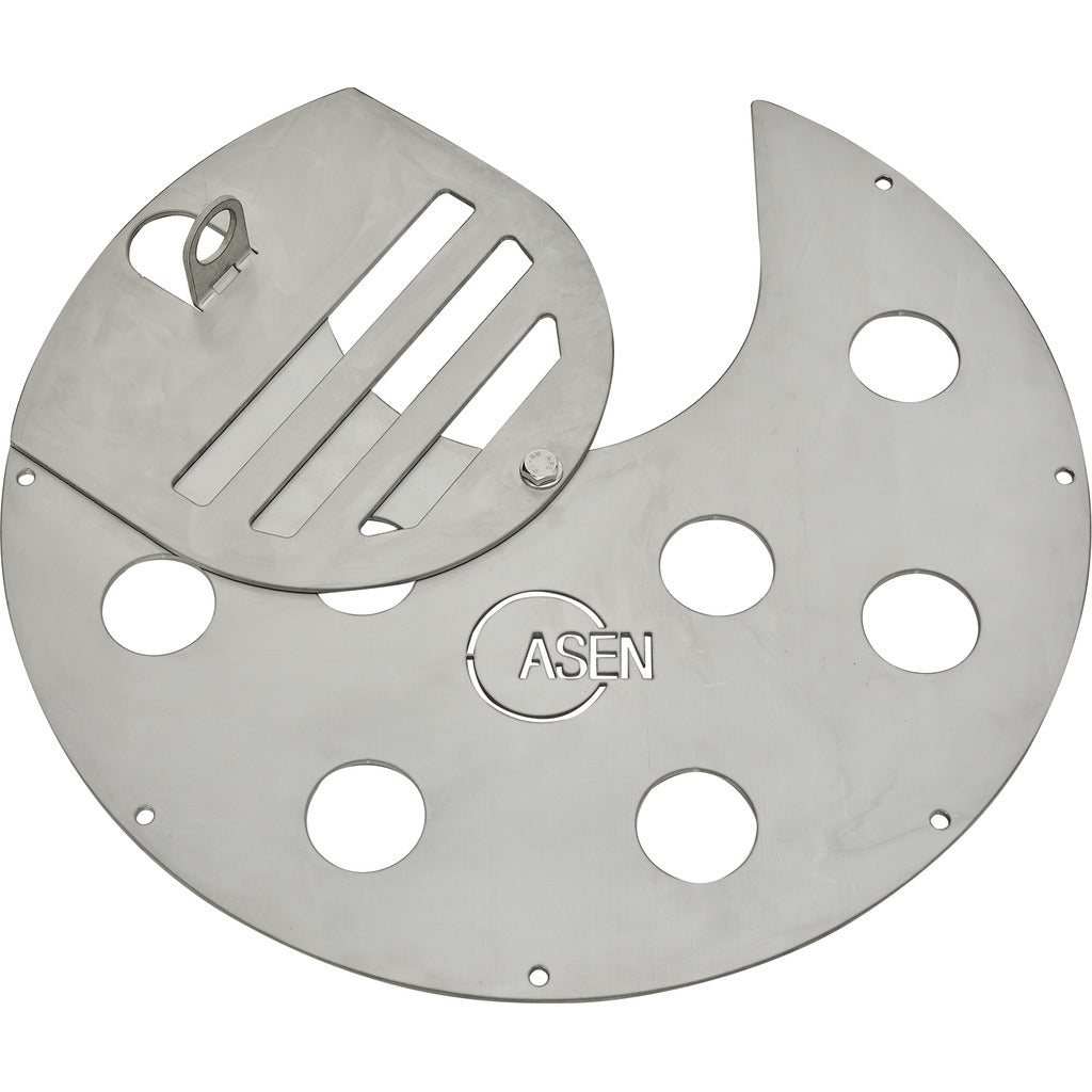 - Auflagerplatte lose aufliegend auf Auflagerring (separat zu bestellen): Blechstärke 4 mm, 1 Stk. U.-förmiger Auschnitt für Saugschlauch, 7 Stk. Befestigungsbohrungen uns 8 Stk. Sichtöffnungen