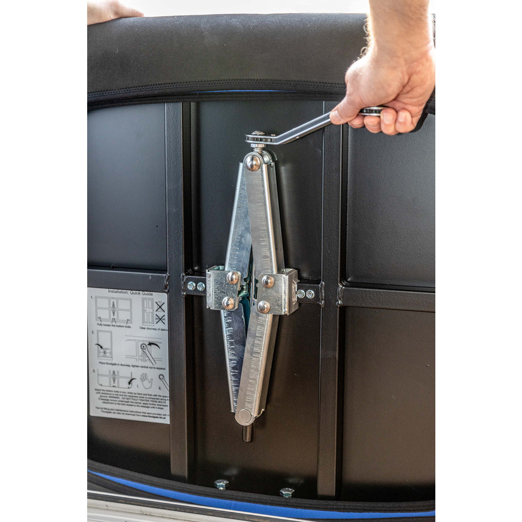 - Herzstück der Floodgate® Tür- und Fenstersperre ist ein stabiler, 25 mm starker Stahlrohrrahmen (Größe XXL mit Stahlrohrrahmen 40 mm), der sich teleskopisch in die Breite und nach unten verstellen lässt; diesen Rahmen umgibt eine 7 mm starke Neoprenummantelung, die als Dichtung und Gleitschutz dient (Neopren ist hochelastisch, öl- und witterungsbeständig und dichtet Unebenheiten hervorragend ab)