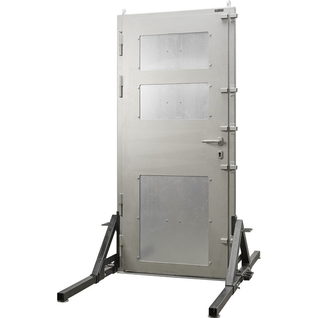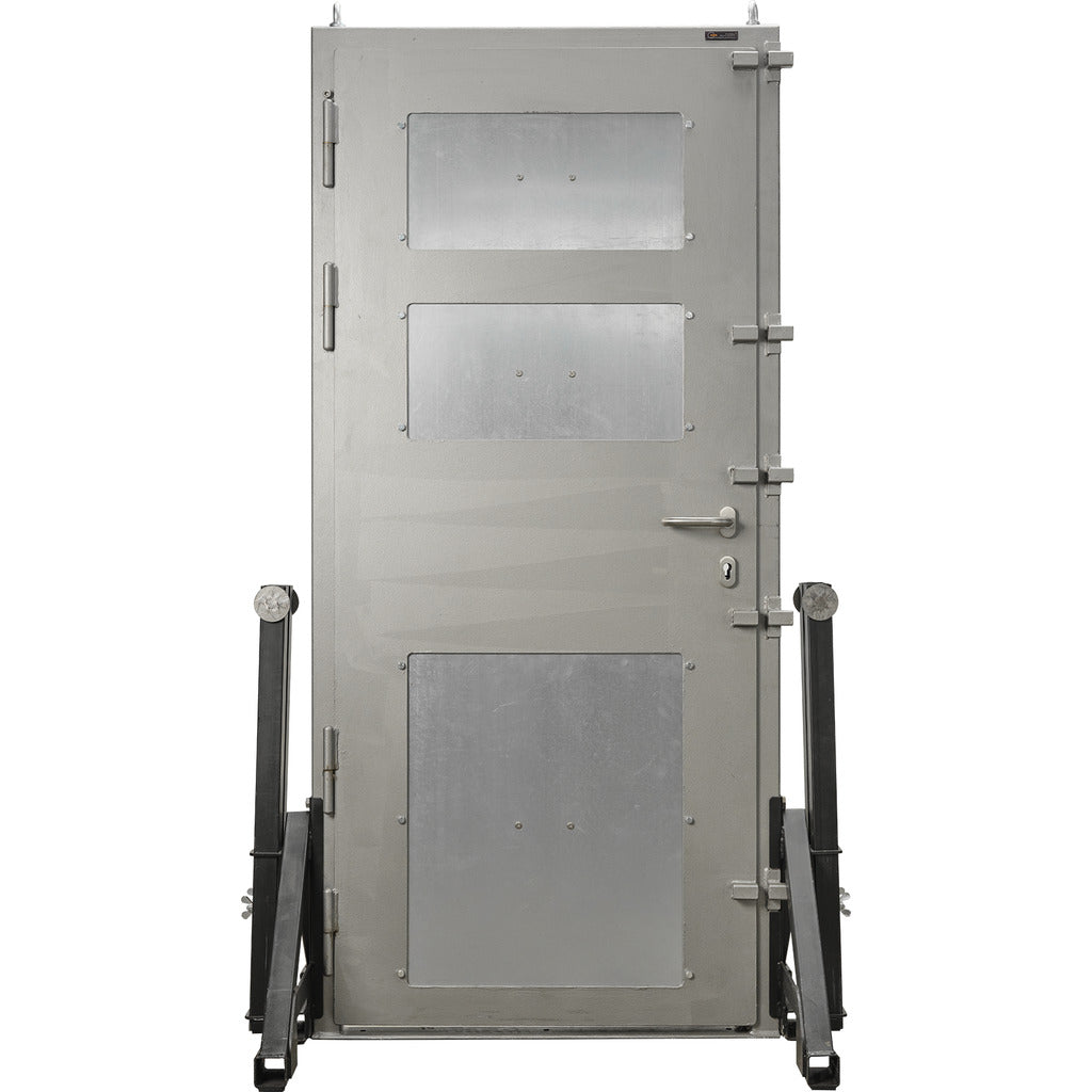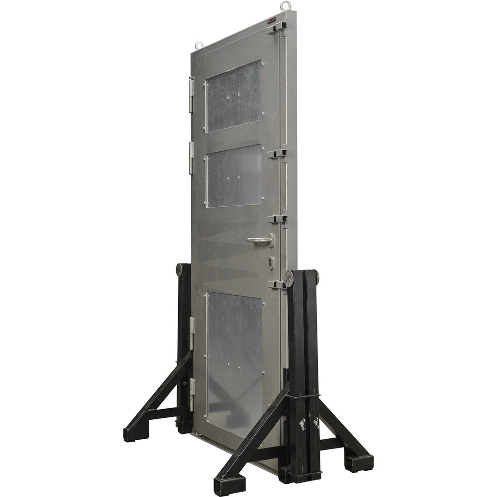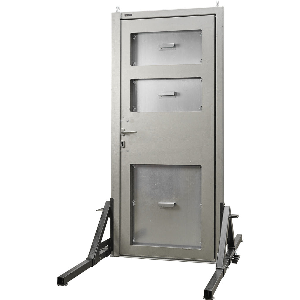- 3 Stk. Öffnungen im Türblatt inklusive mitgelieferten Standard-Stahlblechfüllungen - die Öffnungen sind gerichtet zum Einsetzen von z.B. Holzplatten für das Training mit Löschlanzen usw.